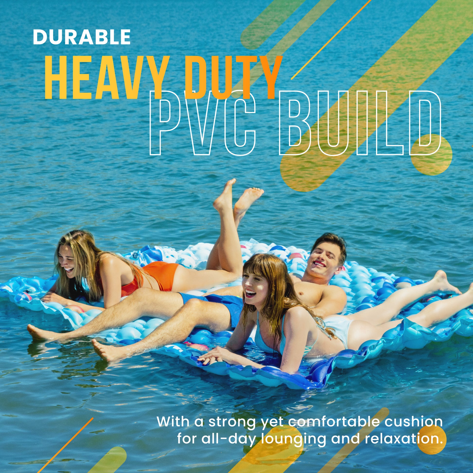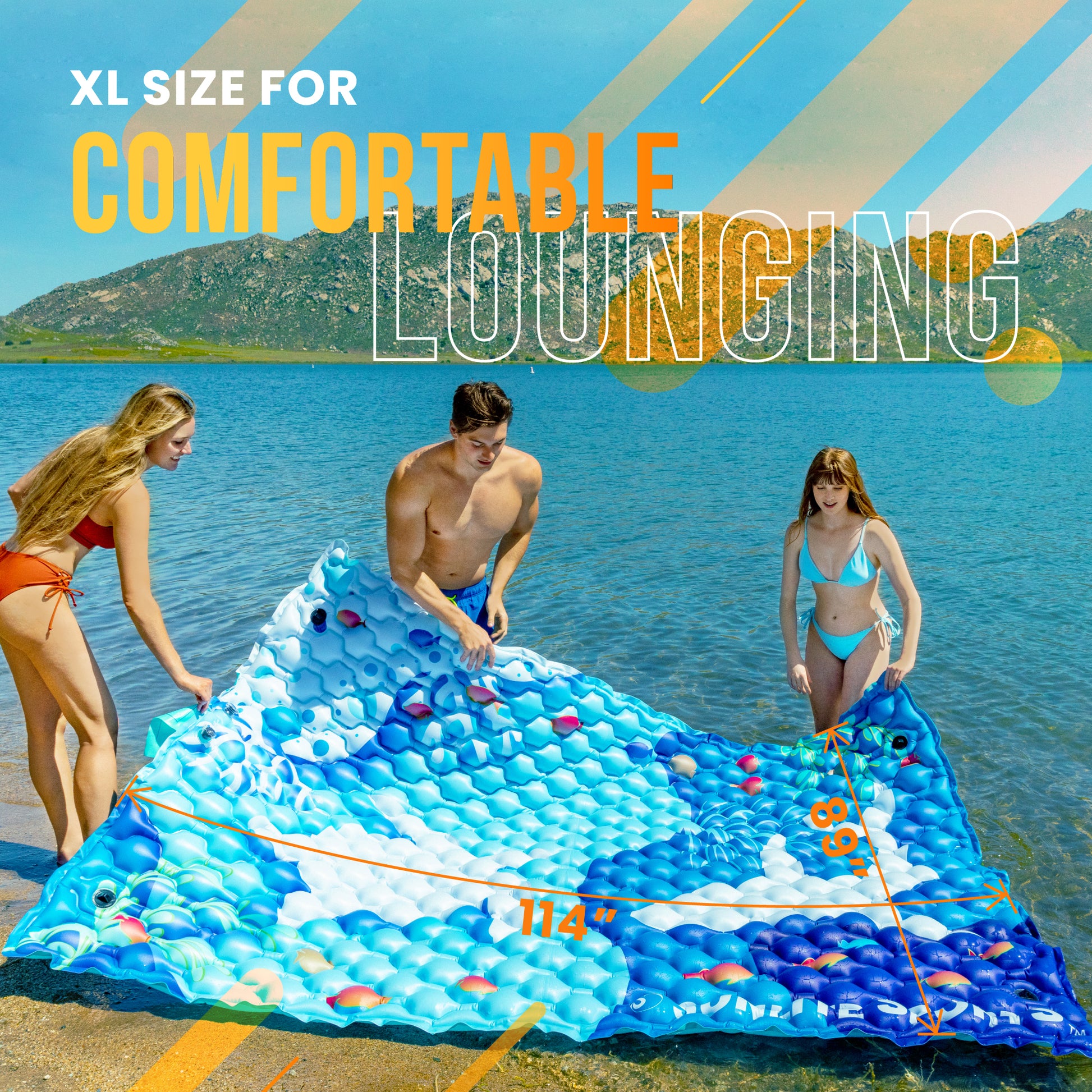 - XL SIZE FOR COMFORTABLE LOUNGING - This spacious water mattress float fits 3-4 people and is extremely comfortable. It has dimensions of 114" x 89". It features a soft and bouncy cushioning, perfect for lounging in the water and soaking up the sun.