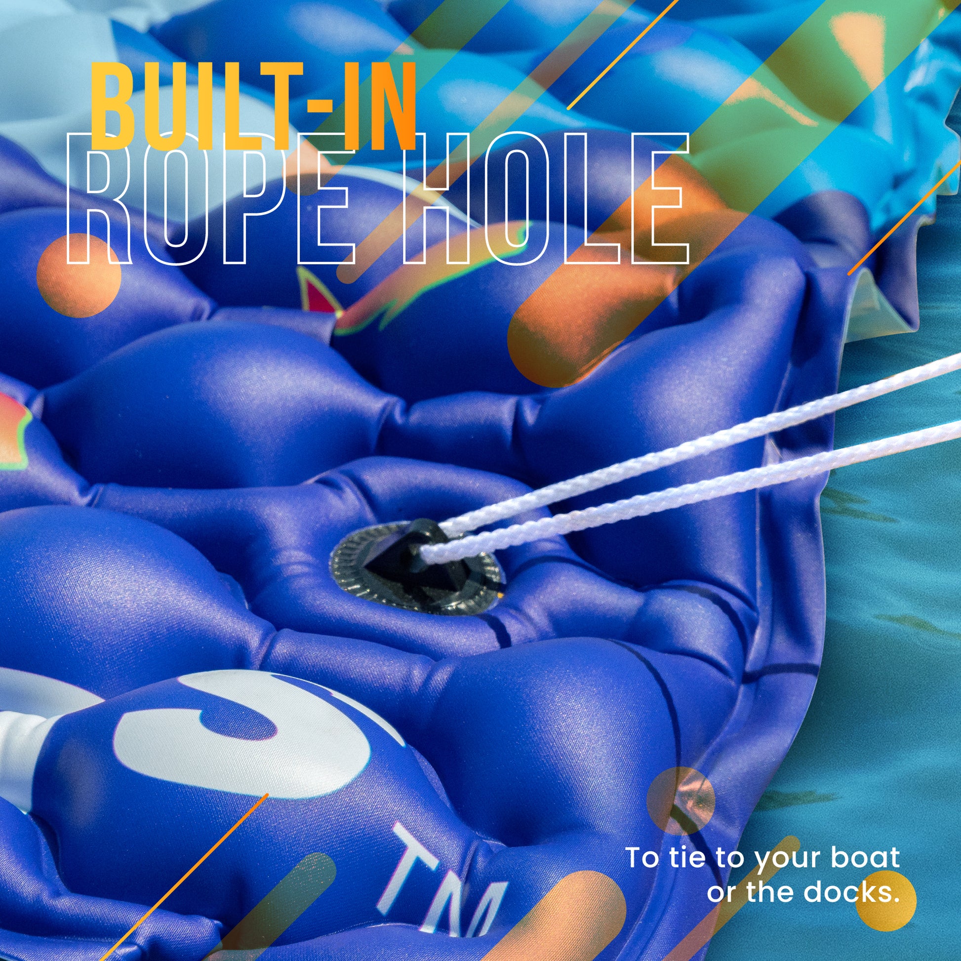 - CAN BE TIED TO BOAT OR DOCKS - The Giant Water Mattress comes with a built-in rope hole in the corner so that you can tie it to your boat or any dock close by. Take it on your next boating run!