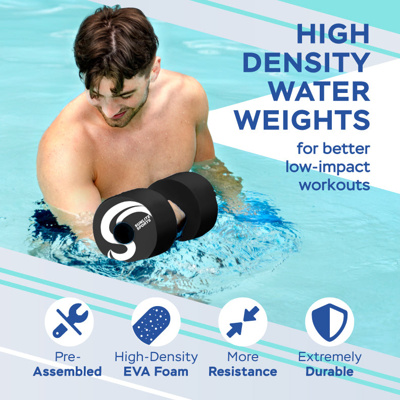 QUALITY BUILD: Made of premium high-density EVA foam, the water dumbbells are chlorine-resistant and dry quickly between uses; they are long-lasting and will not fall apart