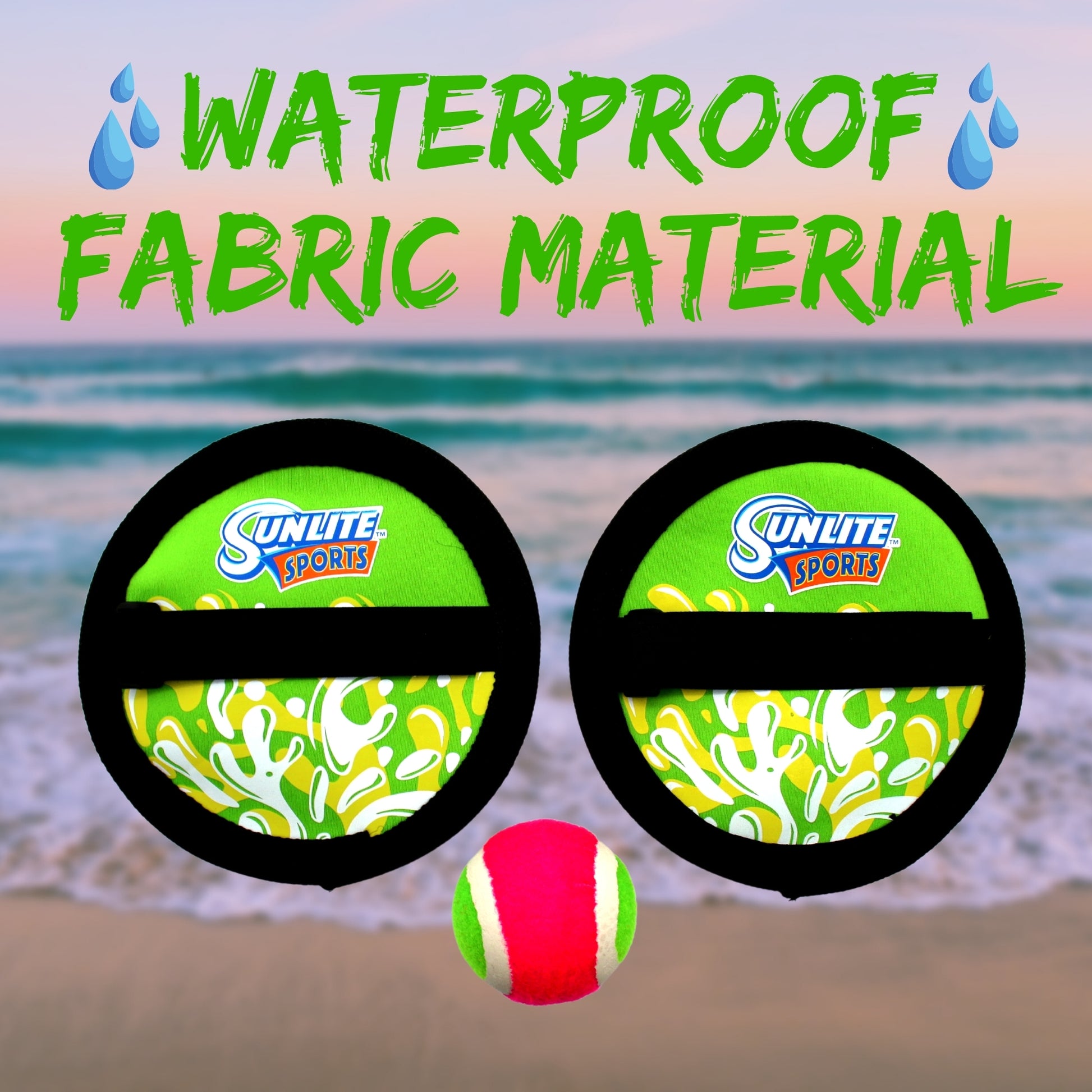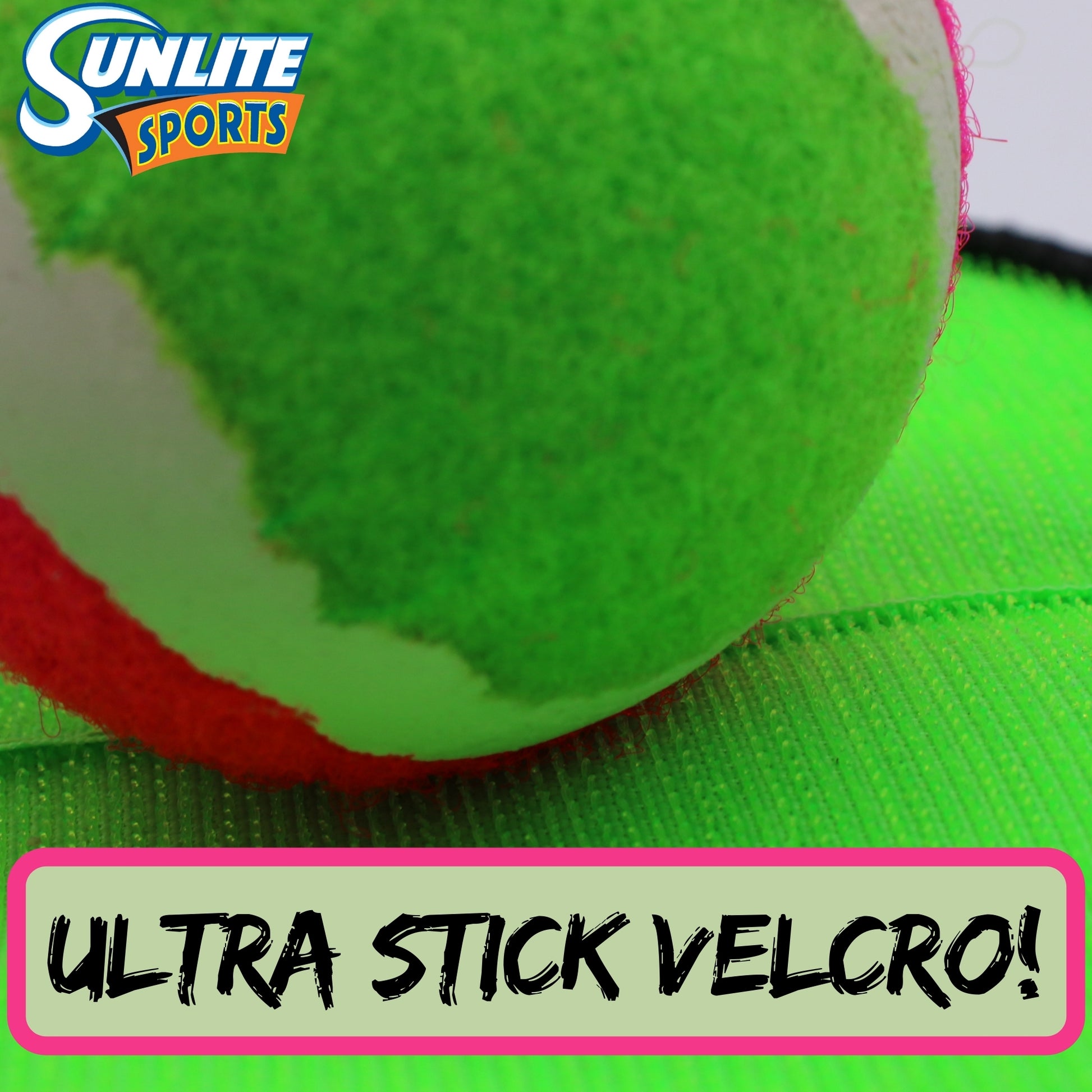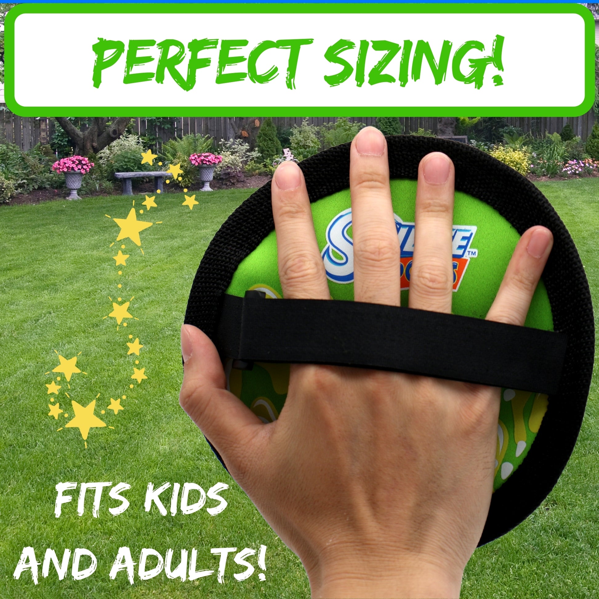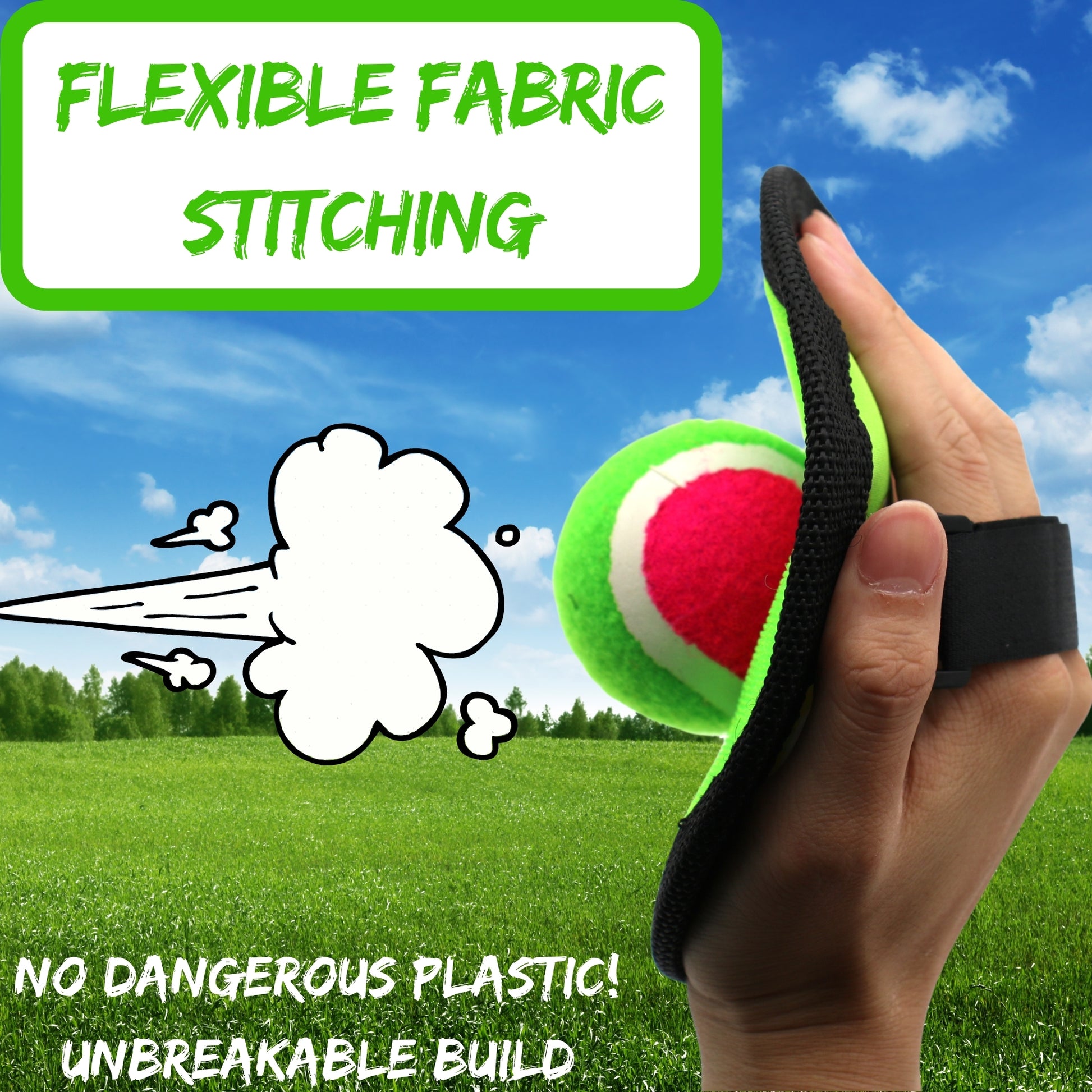 FUN TOSS AND CATCH - Includes two Velcro Hand Catch Pads and one ball. Each glove is fitted with Velcro that easily sticks to the ball.